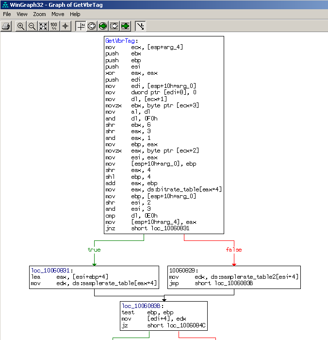 .text:100607D0 GetVbrTag proc near ; CODE XREF: sub_10059240+77p .text:100607D0 .text:100607D0 arg_0 = dword ptr 4 .text:100607D0 arg_4 = dword ptr 8 .text:100607D0 .text:100607D0 mov ecx, [esp+arg_4] .text:100607D4 push ebx .text:100607D5 push ebp .text:100607D6 push esi .text:100607D7 xor eax, eax .text:100607D9 push edi .text:100607DA mov edi, [esp+10h+arg_0] .text:100607DE mov dword ptr [edi+8], 0 .text:100607E5 mov dl, [ecx+1] .text:100607E8 movzx ebx, byte ptr [ecx+3] .text:100607EC mov al, dl .text:100607EE and dl, 0F0h .text:100607F1 shr ebx, 6 .text:100607F4 shr eax, 3 .text:100607F7 and eax, 1 .text:100607FA mov ebp, eax .text:100607FC movzx eax, byte ptr [ecx+2] .text:10060800 mov esi, eax .text:10060802 mov [esp+10h+arg_0], ebp .text:10060806 shr eax, 4 .text:10060809 shl ebp, 4 .text:1006080C add eax, ebp .text:1006080E mov eax, ds:bitrate_table[eax*4] .text:10060815 mov ebp, [esp+10h+arg_0] .text:10060819 shr esi, 2 .text:1006081C and esi, 3 .text:1006081F cmp dl, 0E0h .text:10060822 mov [esp+10h+arg_4], eax .text:10060826 jnz short loc_10060831 .text:10060828 mov edx, ds:samplerate_table2[esi*4] .text:1006082F jmp short loc_1006083BI think you agree with me that this is a clear case. I also want to mention that the entire id3lib library (also LGPL software) is in the file too. Thankfully id3lib is written in C++ and not in C and therefore finding matches is significantly faster as the original function names are part of the binary files (thanks for the debug build too). Just click this link to see some of the id3lib functions in the file. I want to summarize what we have and raise a few questions at this point: - The LGPL is not mentioned on the CD. - That means no copyright notice as the LGPL demands either. - Does an OCX qualify as a linked library? Probably. But I am not able to re-create the OCX file because it contains at least two LGPL libraries and additional (probably proprietary) code. Is this necessary to be LGPL-compliant? (see the end of the article). - Are the files part of this LGPL-licensed software by Sony? Does that have any effect on the legality of the OCX? The first two points would still stand. All this legalese is killing me, I can only report on the code. I think we've reached a certain point where it's time to take a break. We've definitely found LGPL code in the software. Now it's time for the license gurus to find out if that constitutes a license violation. Until this is cleared up I think I'm going to do something else. Edit: There are differences in opinion about what constitutes a LGPL infringement. Wikipedia says "Essentially, it must be possible for the software to be linked with a newer version of the LGPL-covered program. The most commonly used method for doing so is to use "a suitable shared library mechanism for linking". Alternatively, static linking is allowed if either source code or linkable object files are provided." Does that mean everybody must be able to recreate the OCX file? Or what does that mean? Comments