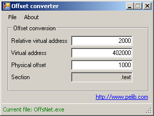 first example program demonstrates how to use PeLib.NET in C# 2005 to code a small program to convert between RVA, VA and physical offset.